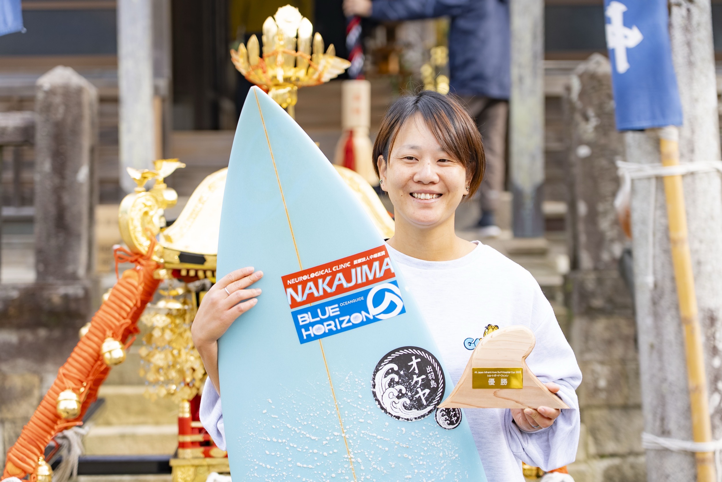 ウィメンクラスで優勝した島出身サーファーがトロフィーを持って帰ってきた